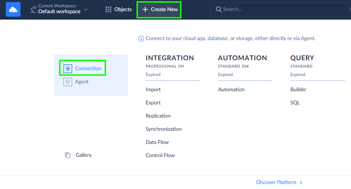 - Click +Create New → Integration, then choose the appropriate scenario (Import or Data Flow).